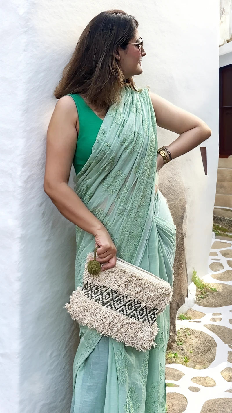 Pure Mul Cotton Saree With Chikankari Embroidery & Tassels